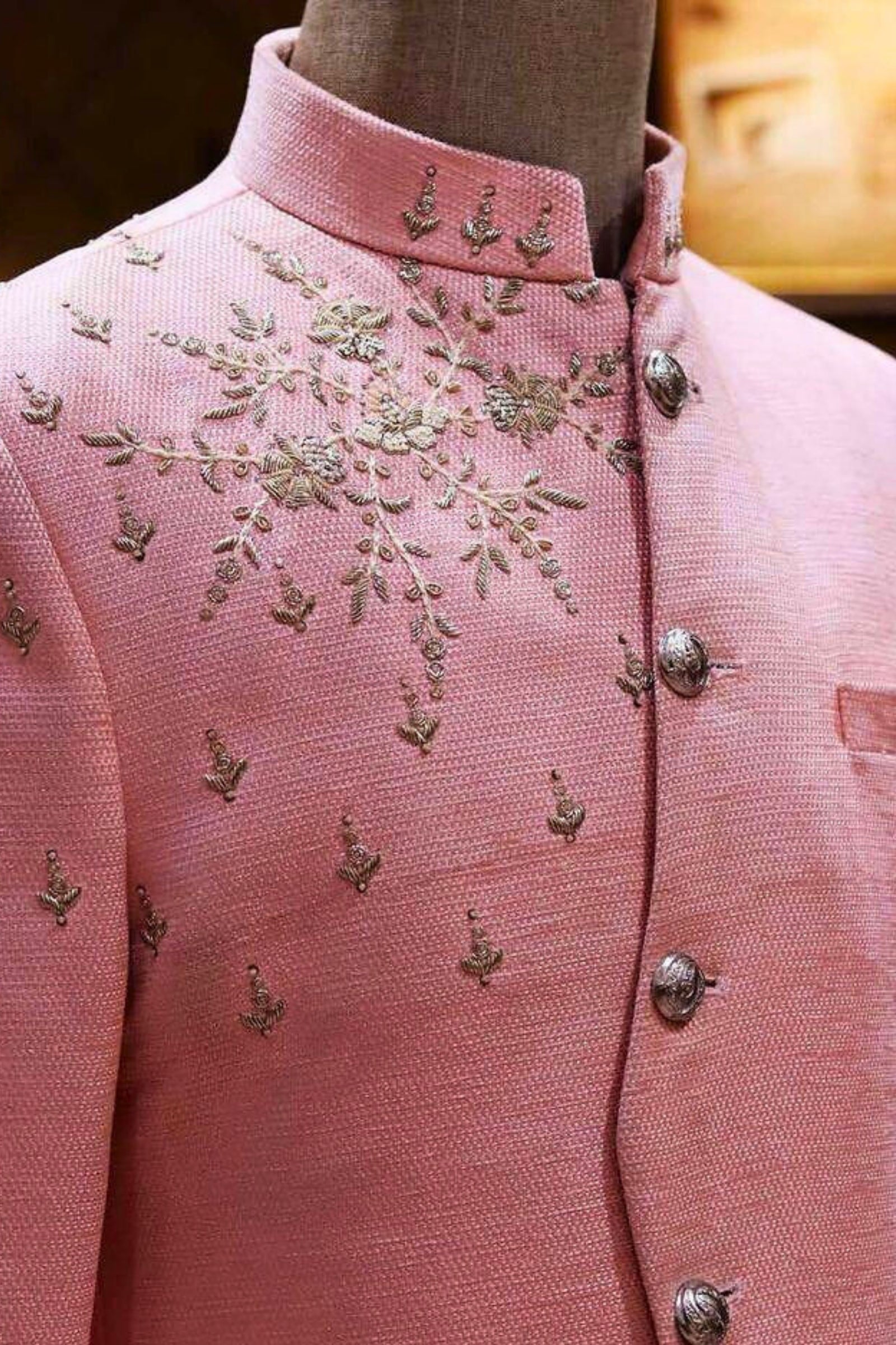 Delicate and graceful, this lite pink sherwani exudes timeless charm with subtle yet intricate embroidery. The soft pink hue reflects elegance and sophistication, enhanced by expert craftsmanship. Perfect for weddings, receptions, and festive occasions, this sherwani ensures the groom makes a stylish and regal impression.