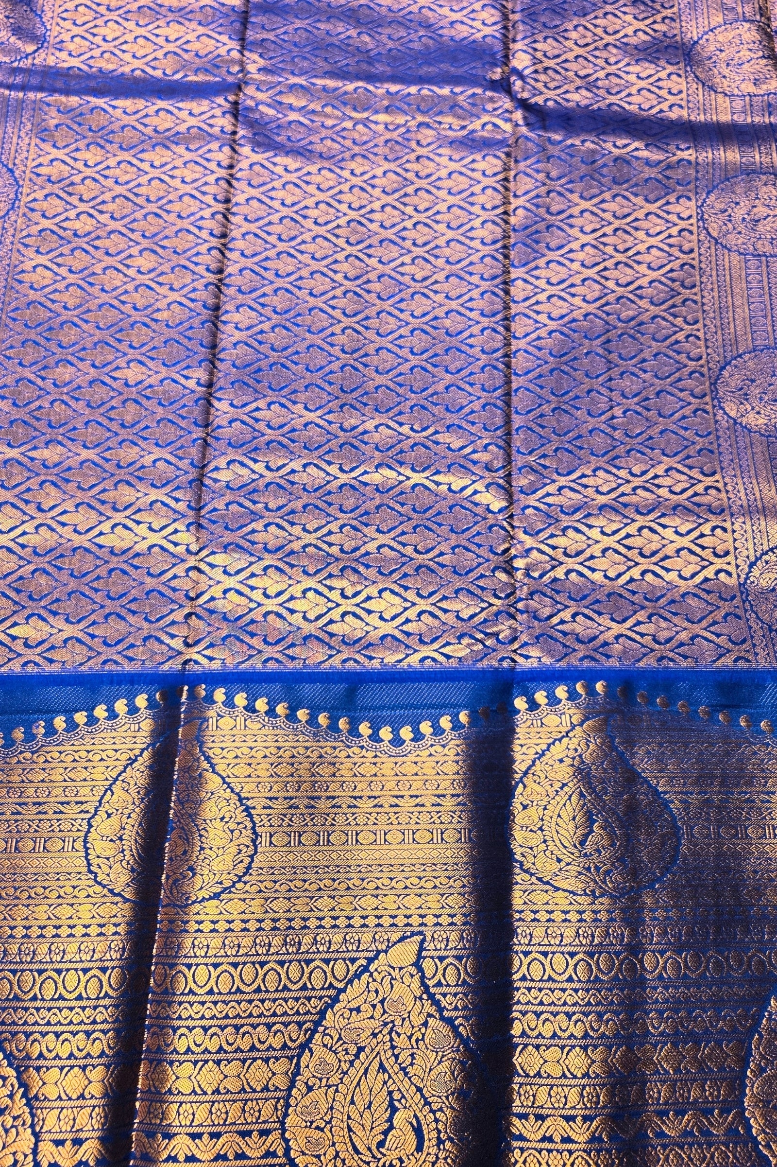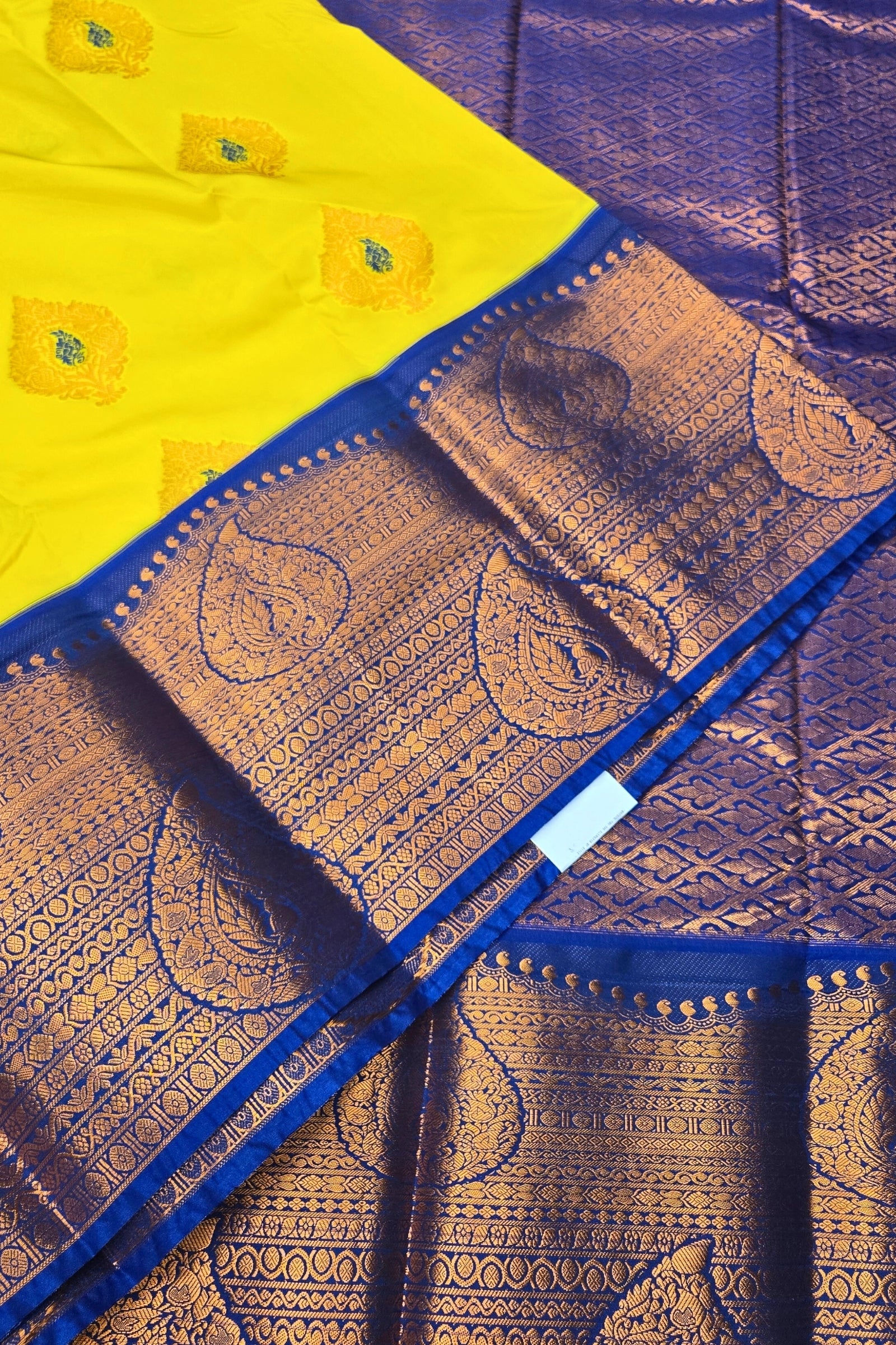 Embrace a refreshing traditional look with this Yellow Kanchipuram Silk Saree, accentuated by a graceful light blue border. Handwoven with fine silk threads, this saree beautifully balances brightness and serenity. Its subtle zari work and rich texture make it a perfect choice for festive gatherings, temple visits, and elegant celebrations.