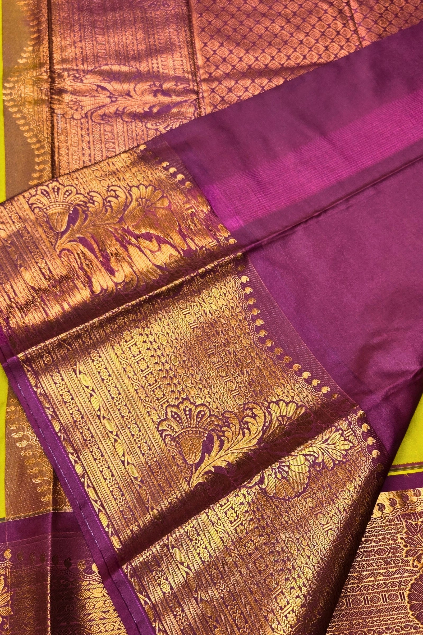 Elegant Green Semi Kanchi Silk Saree with Purple and Gold Border
