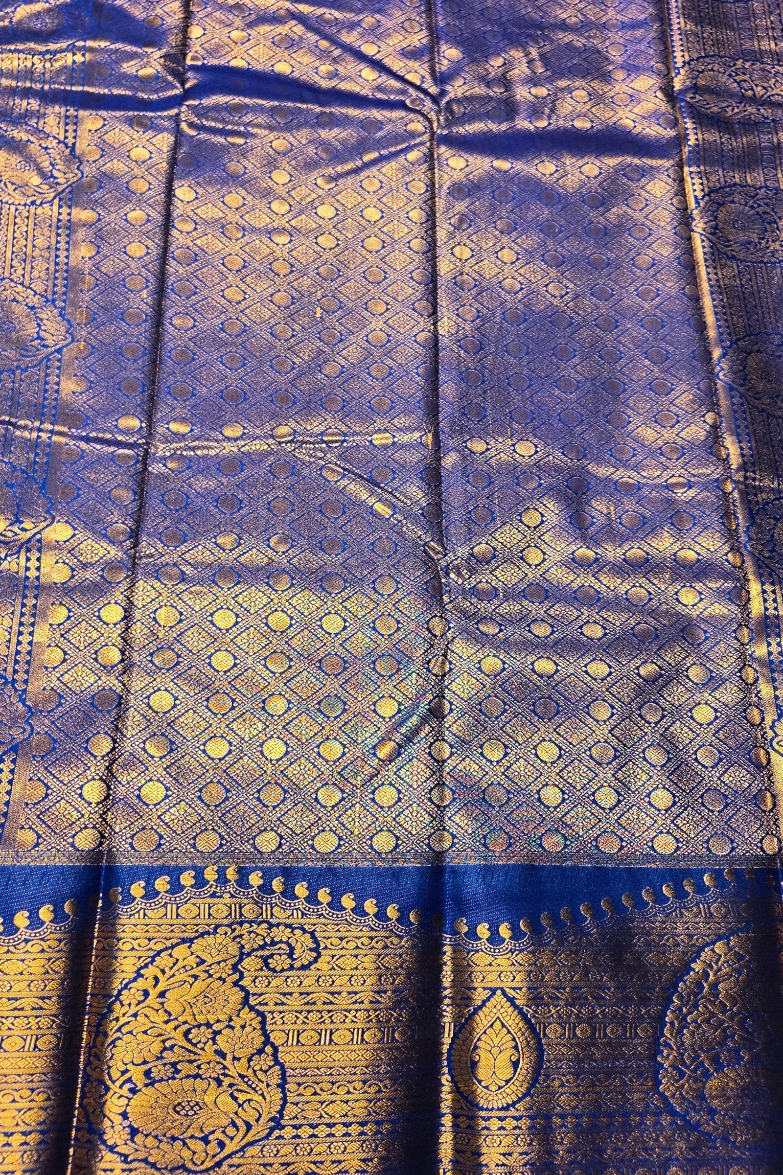 Pallu: Rich royal blue pallu with intricate zari detailing