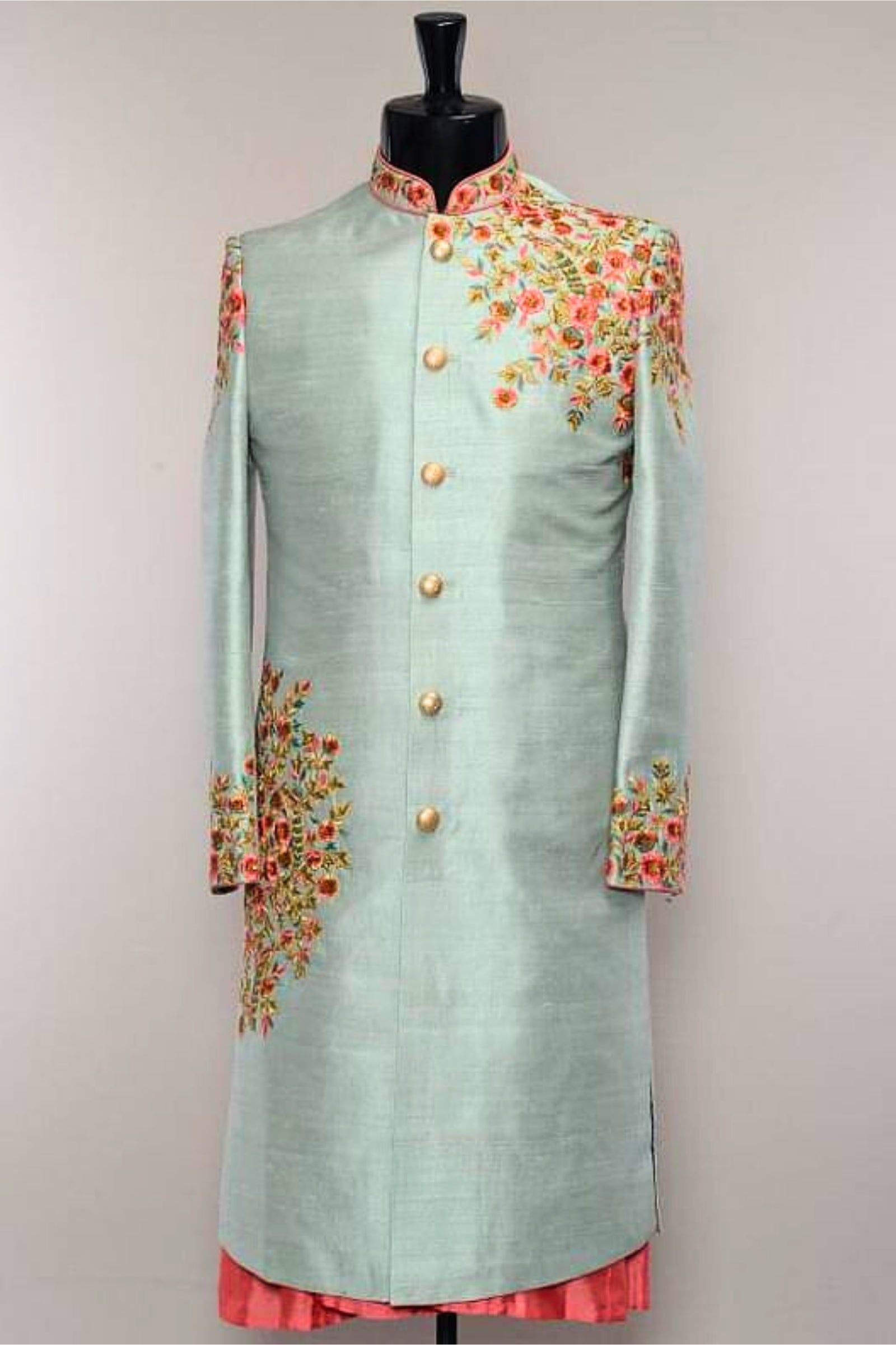 Refreshing yet regal, this light blue sherwani with delicate pink embroidery is crafted for grooms who prefer a unique blend of elegance and charm. The soft blue base symbolizes serenity, while the contrasting pink threadwork adds vibrancy and a touch of contemporary flair. Perfect for daytime weddings, festive occasions, and cultural celebrations, this sherwani ensures you stand out with sophistication.