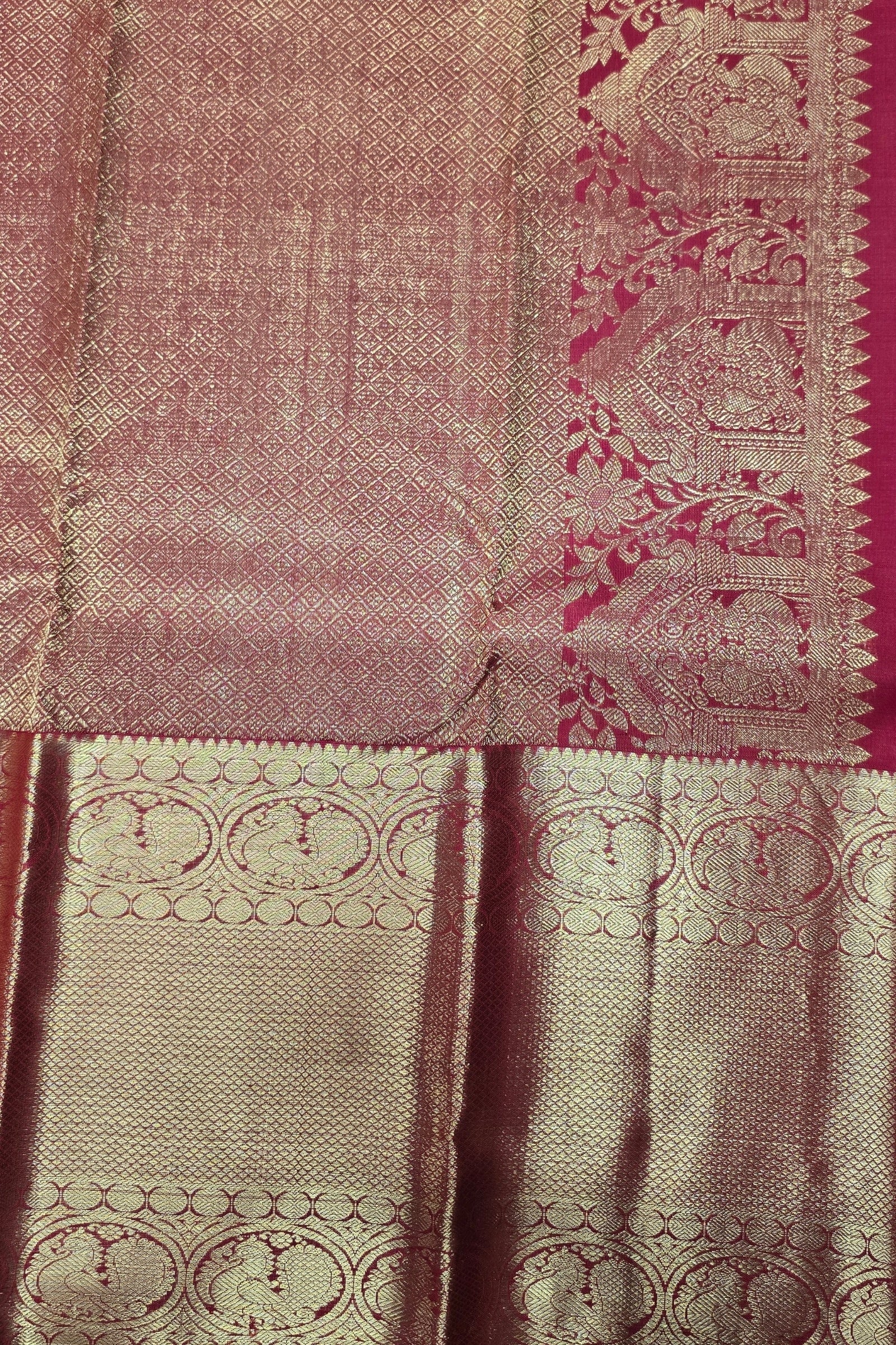 • Pure Kanchipuram silk with intricate gold patterned weaving