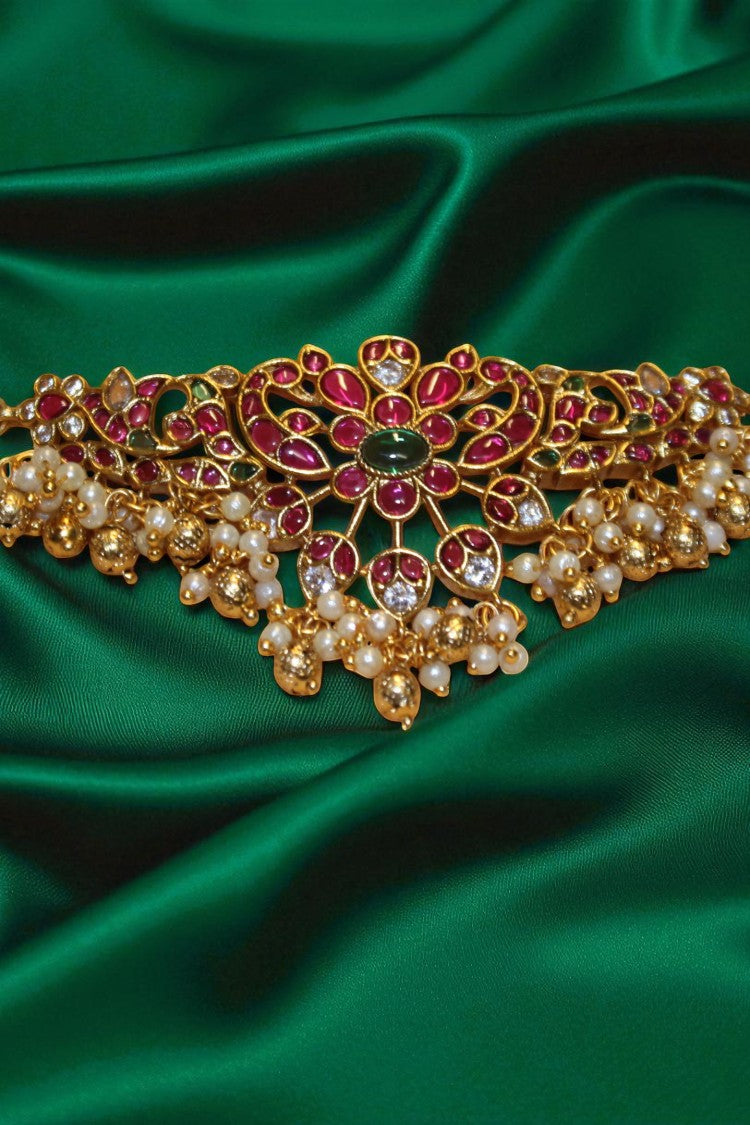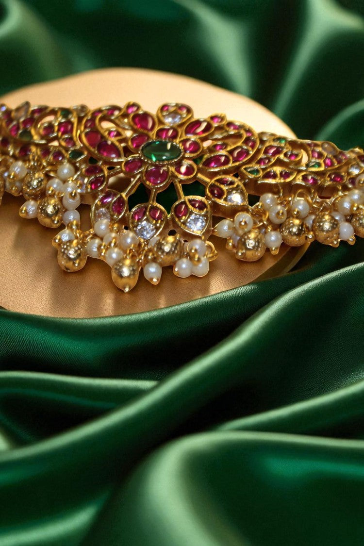 The Regal Bloom Necklace Set radiates luxury and timeless allure with its brilliant pink stones and exquisite craftsmanship. Designed for those who love to make a statement, this heavy necklace paired with matching earrings adds unmatched elegance to bridal and festive attire. Its intricate detailing and sparkling finish make it a true showstopper for any grand occasion. Key Features: Heavy handcrafted necklace with matching earrings Adorned with premium pink stones for a dazzling effect Elegant design perfect for weddings and festive celebrations Superior craftsmanship with lasting shine and durability Comfortable to wear while offering a rich, opulent look