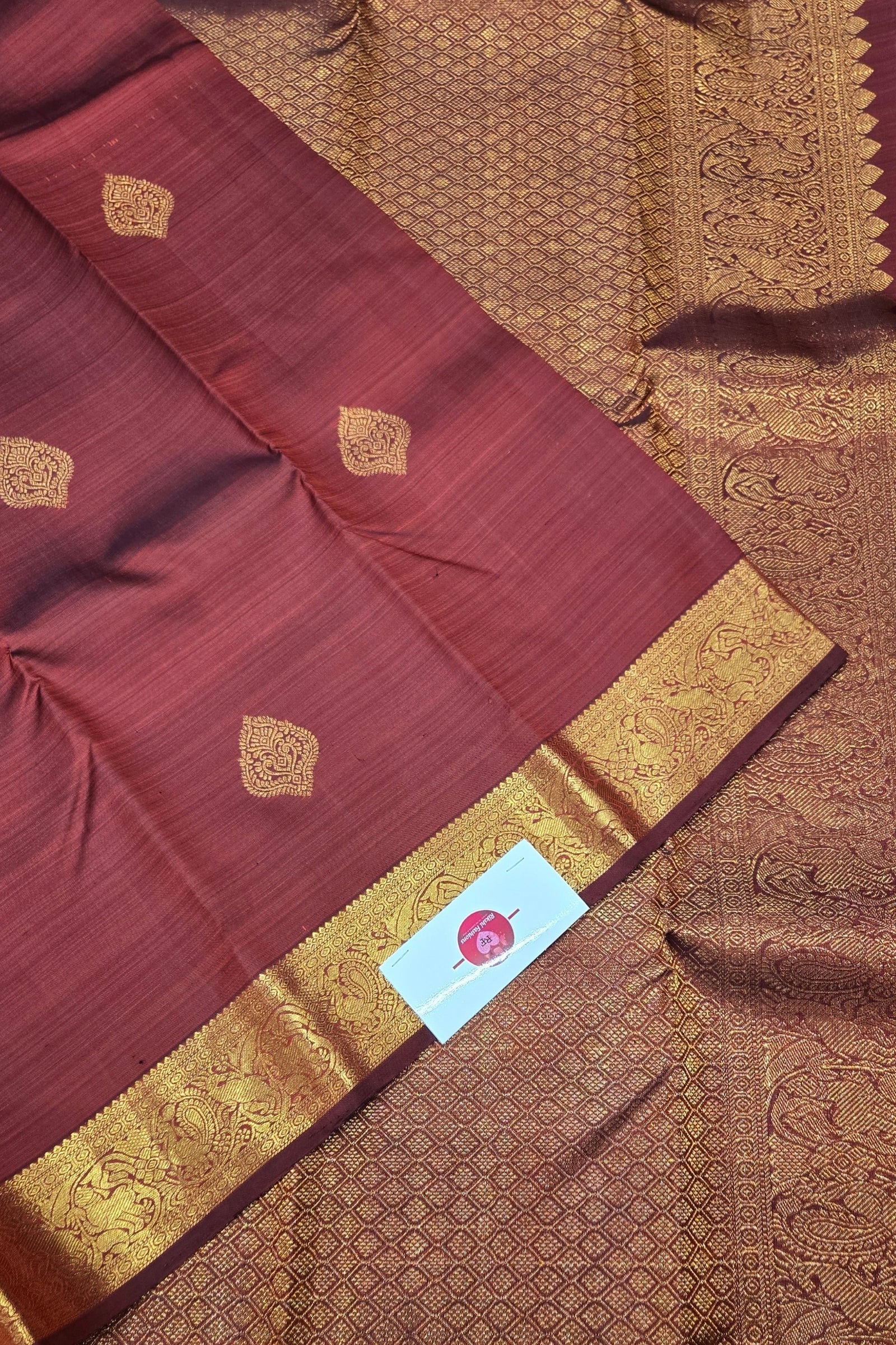 • Pure Kanchipuram silk with traditional gold zari border