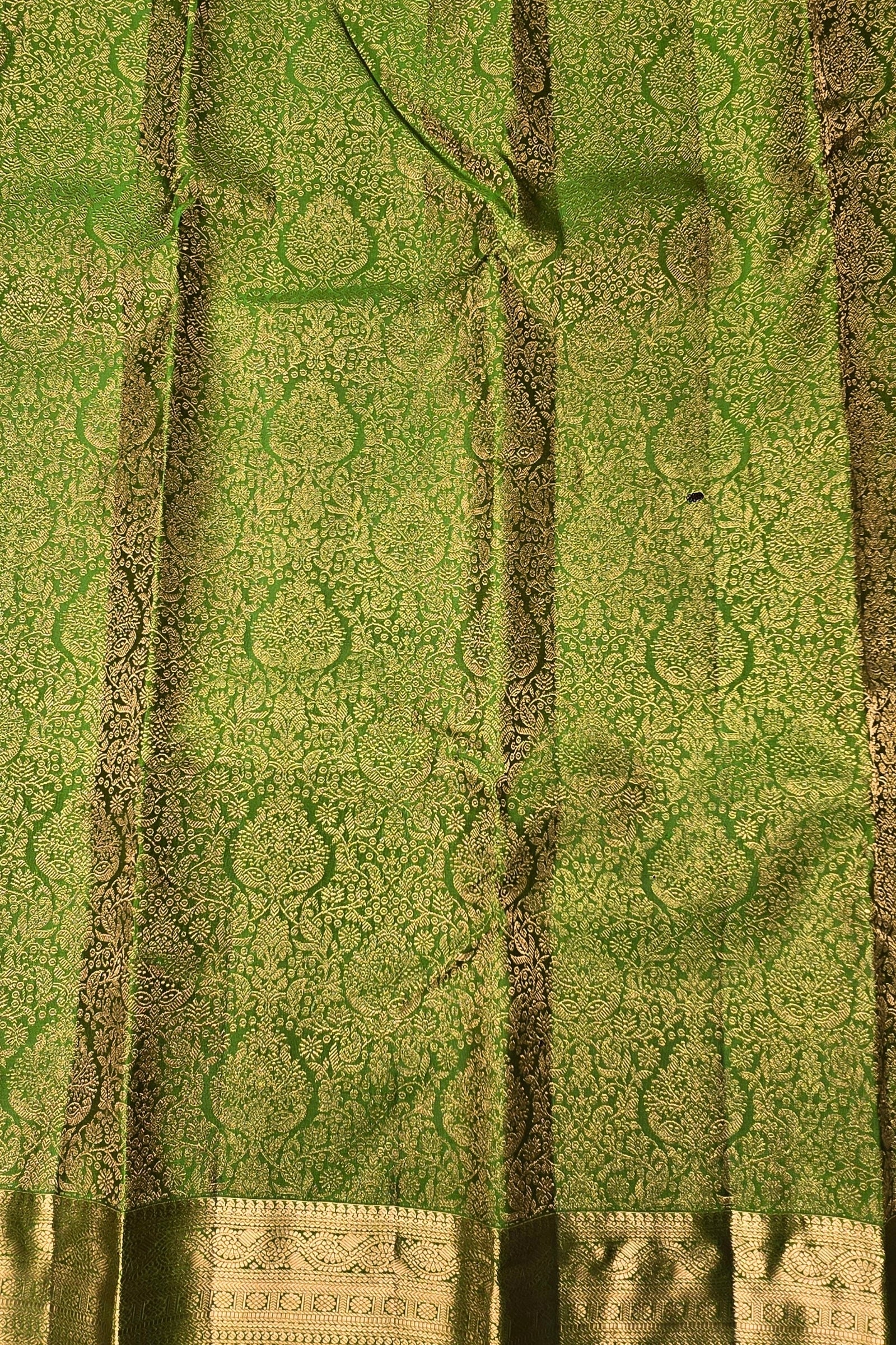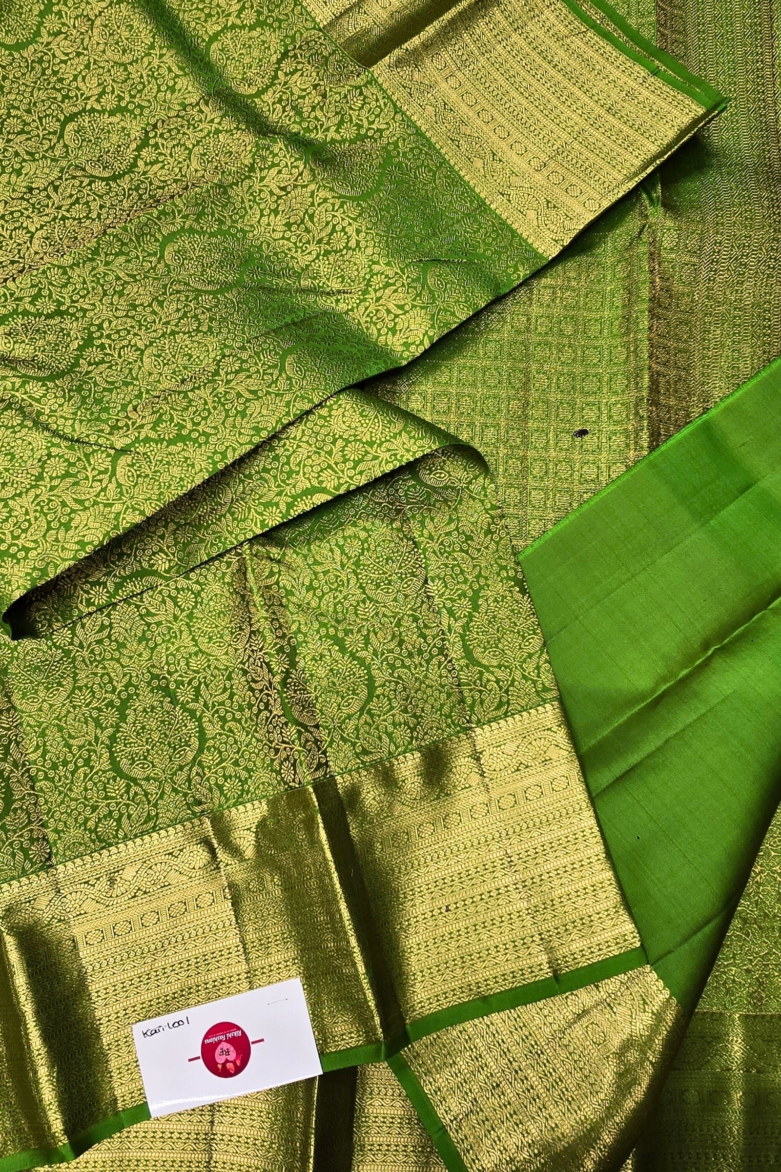 A rich Kanchipuram silk saree in an elegant olive green shade, beautifully enhanced with intricate zari weaving. Combining traditional artistry with refined charm, this saree is a graceful choice for weddings, festive celebrations, and cultural occasions.